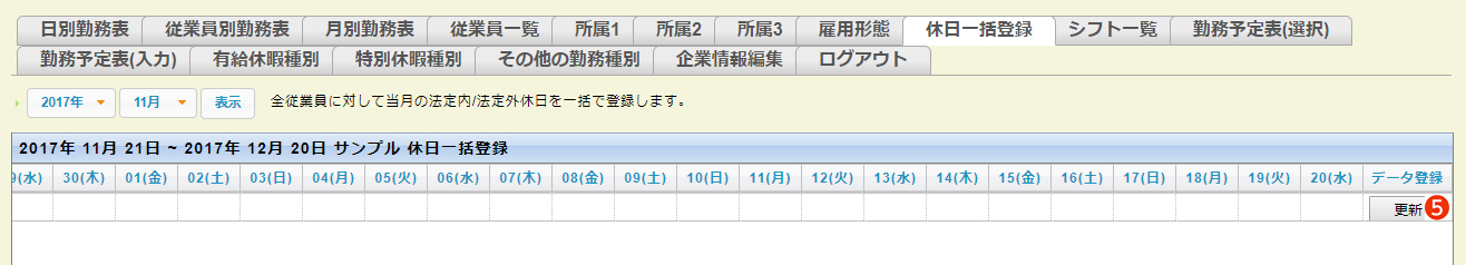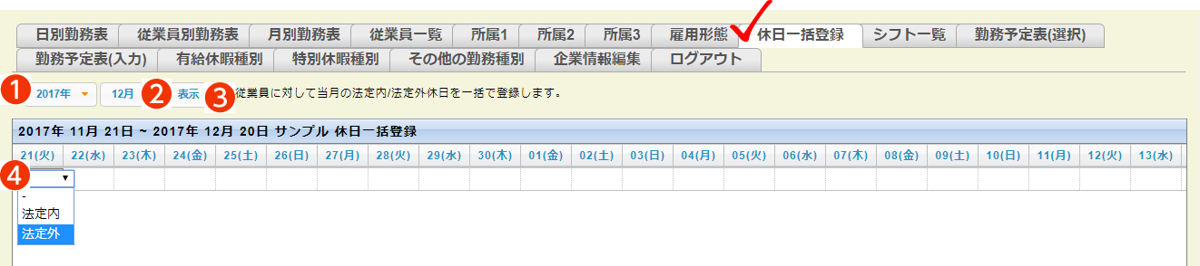 従業員の法定内/法定外休日を一括編集、登録ができます。